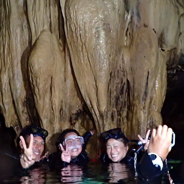 洞窟は岬の岩壁にあいたトンネル状の鍾乳洞で半水面になっており、水面からでも水中からでも楽しむことが出来ます。